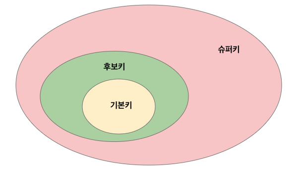 - 슈퍼키 superkey: tuple 유일하게 식별할 수 있는 속성 or 속성집합