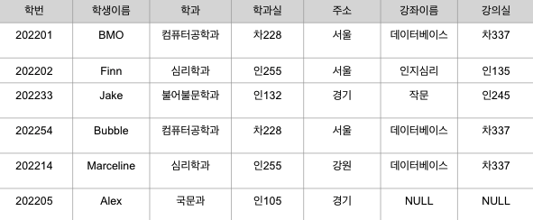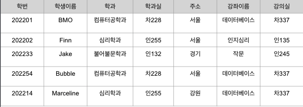 수강정보 테이블에 학생, 학과, 강좌 정보를 한꺼번에 쓴 테이블.