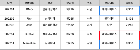 "데이터베이스" 강의실에 대한 정보가 한 학생의 튜플만 업데이트 된다면... 데이터 불일치 문제가 일어난다.