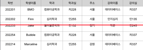 학과, 강의 정보 릴레이션이 따로 없다면 Jake의 수강정보를 지웠는데 불문과 정보와 작문강좌에 대한 정보 모두 없어진다.